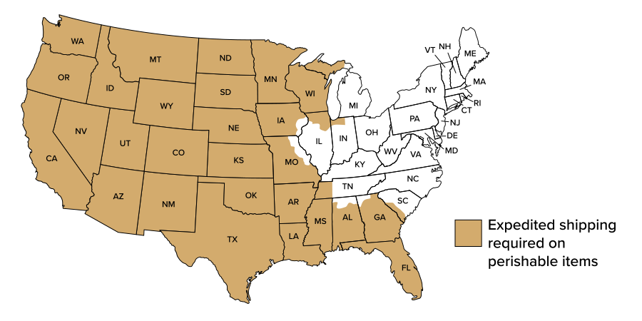 This item contains fresh fruit and/or cheese. If shipping to the tan area on
